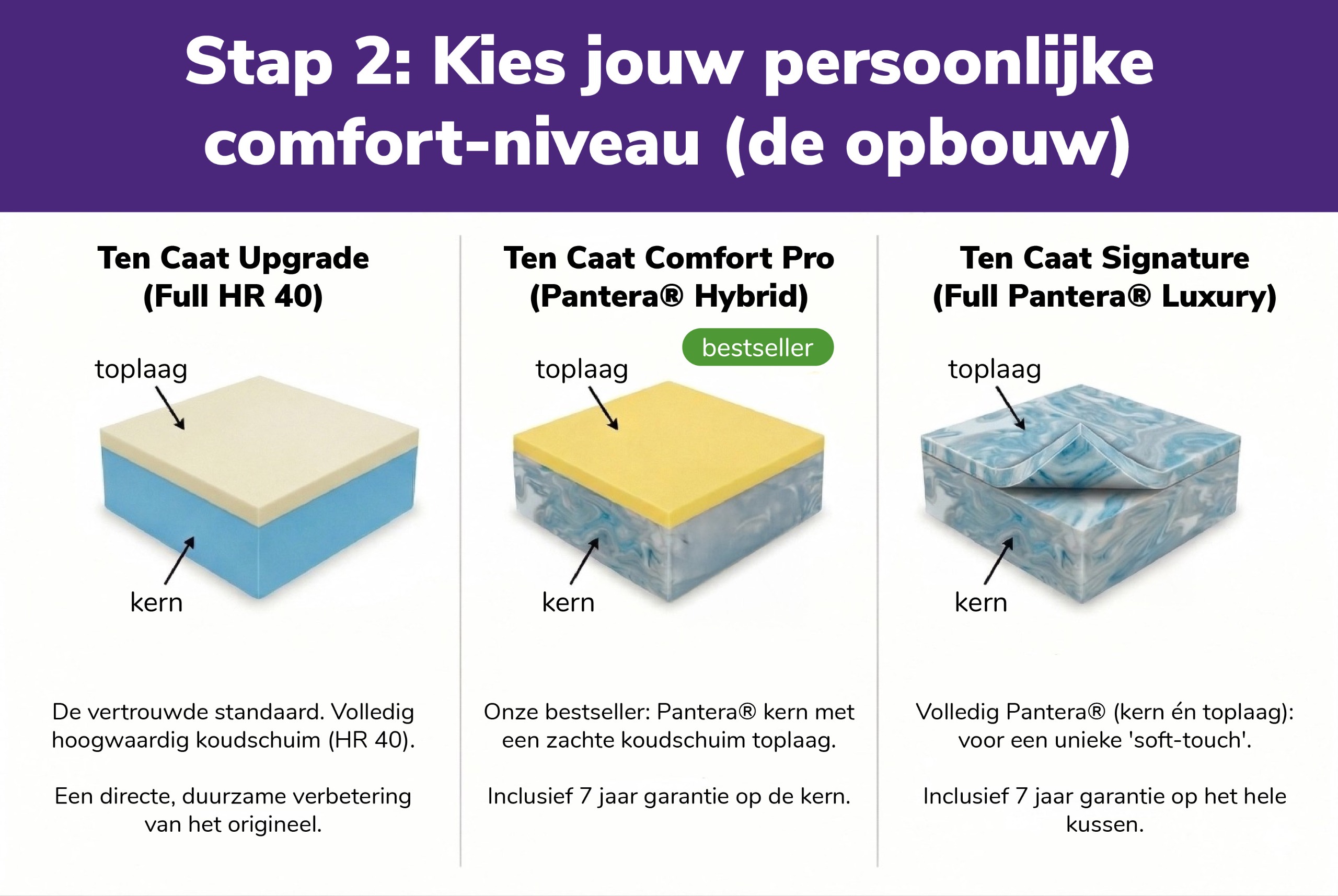 - Ten Caat Comfort Pro (Pantera® Hybrid): Onze bestseller voor jarenlang plezier. Een kern van Pantera® gecombineerd met een toplaag van zacht koudschuim. Inclusief 7 jaar garantie op de kern.